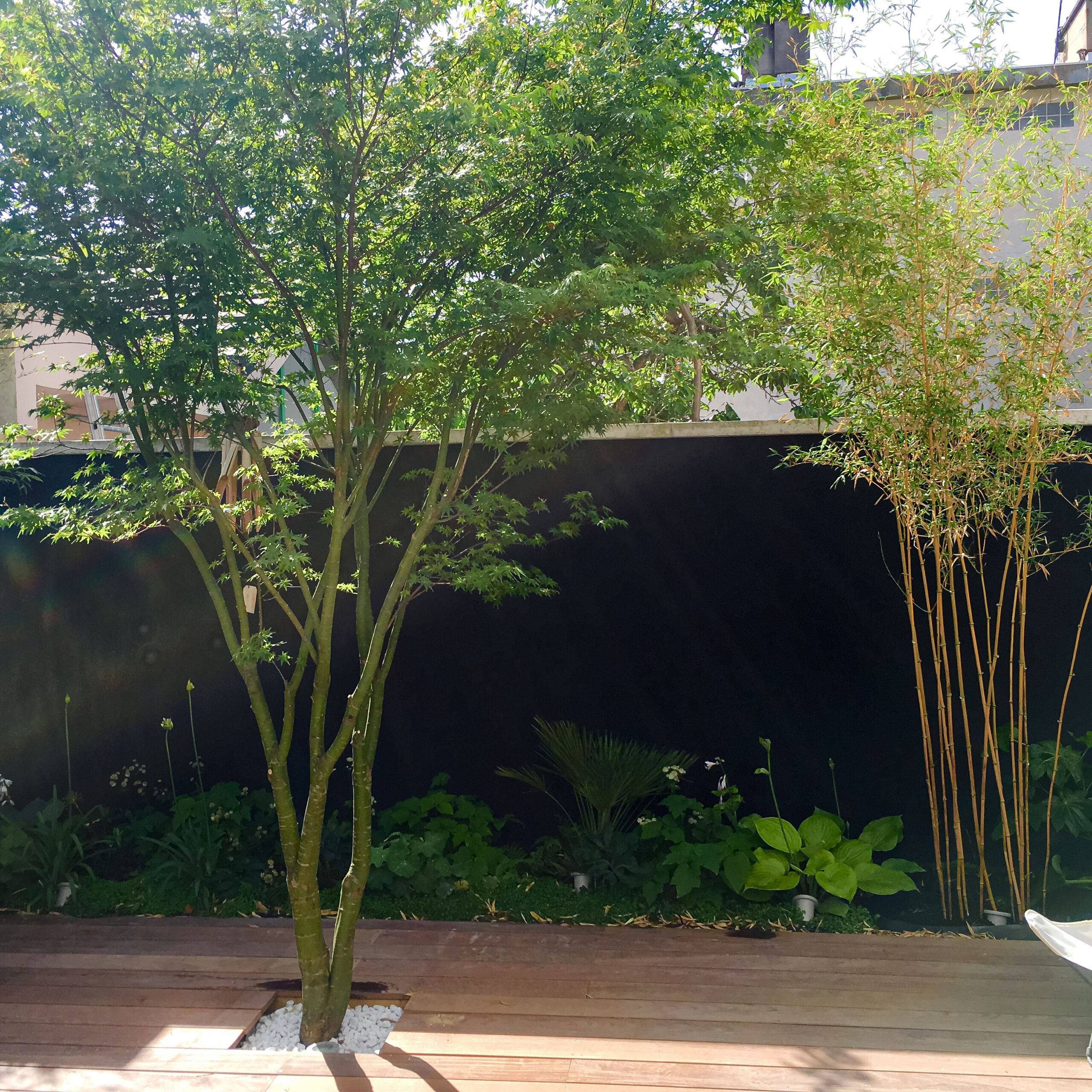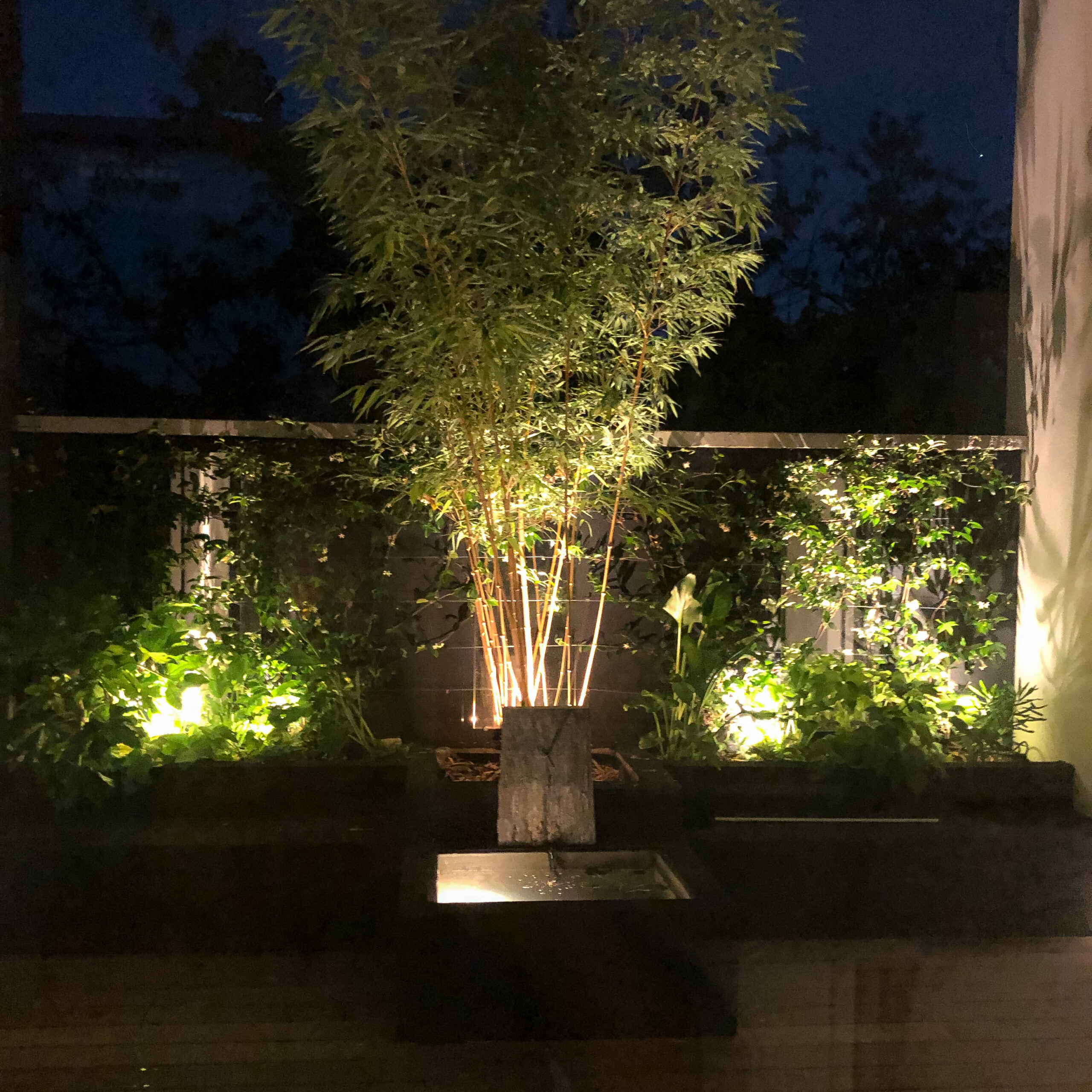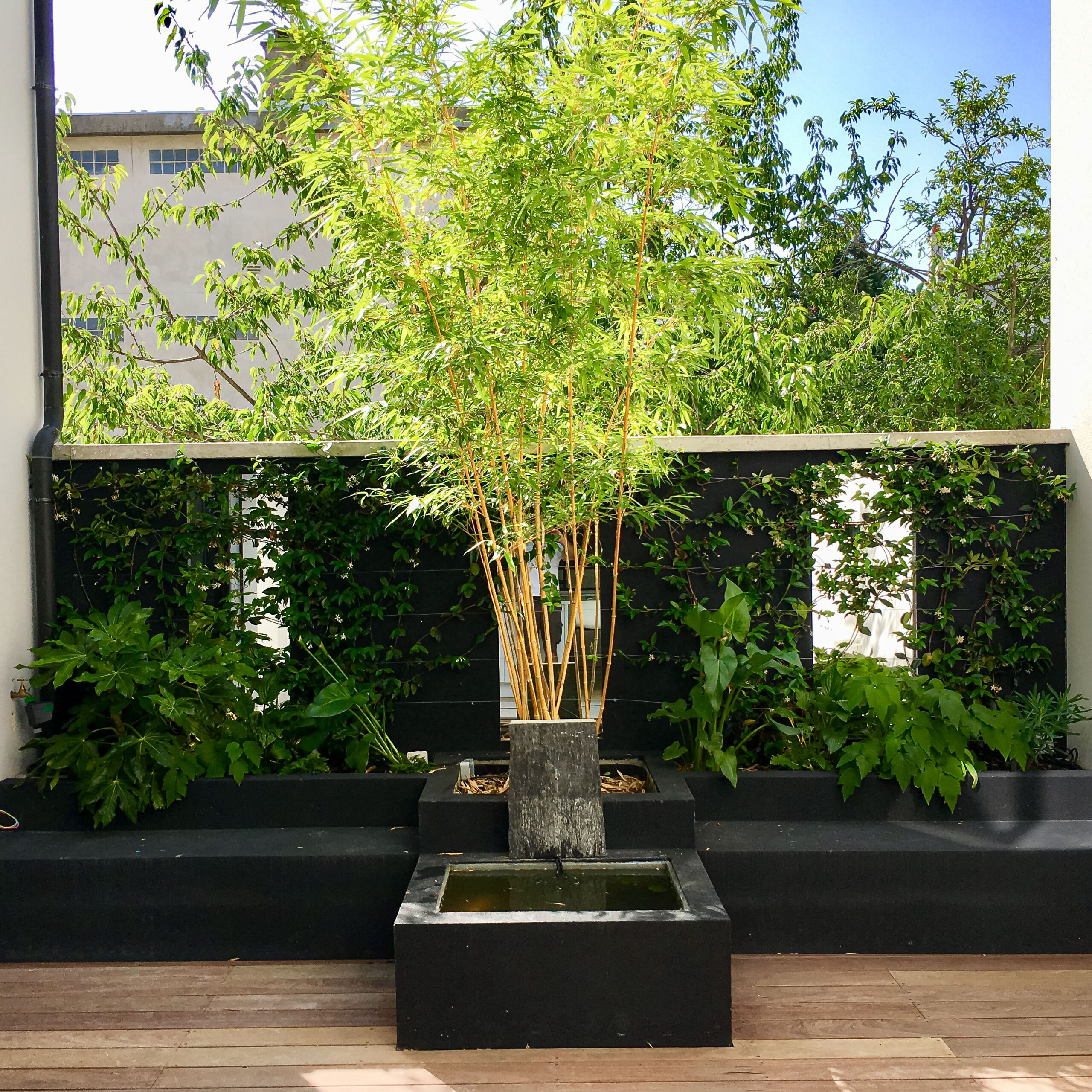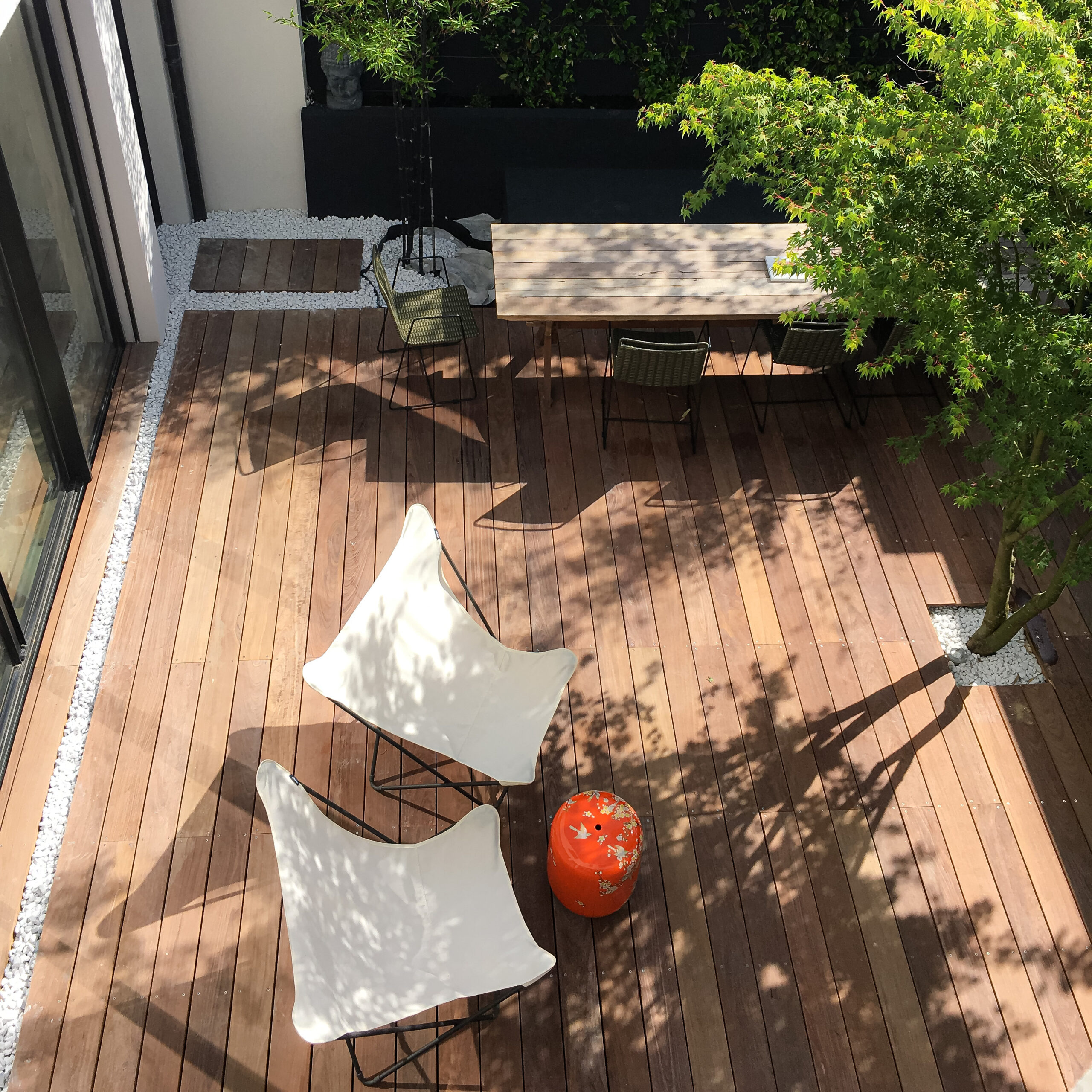 Maison contemporaine Le projet : Aménager deux patios distincts avec deux usages différents mais avec une unité de traitement. Un soin particulier a été apporté à l'éclairage, dans les galets et seuil de plancher bois et dans la végétation. Rail lumineux, spots et mini projecteurs. Asnières sur Seine 92 Conception Fabio Pane Chantier LADPJ