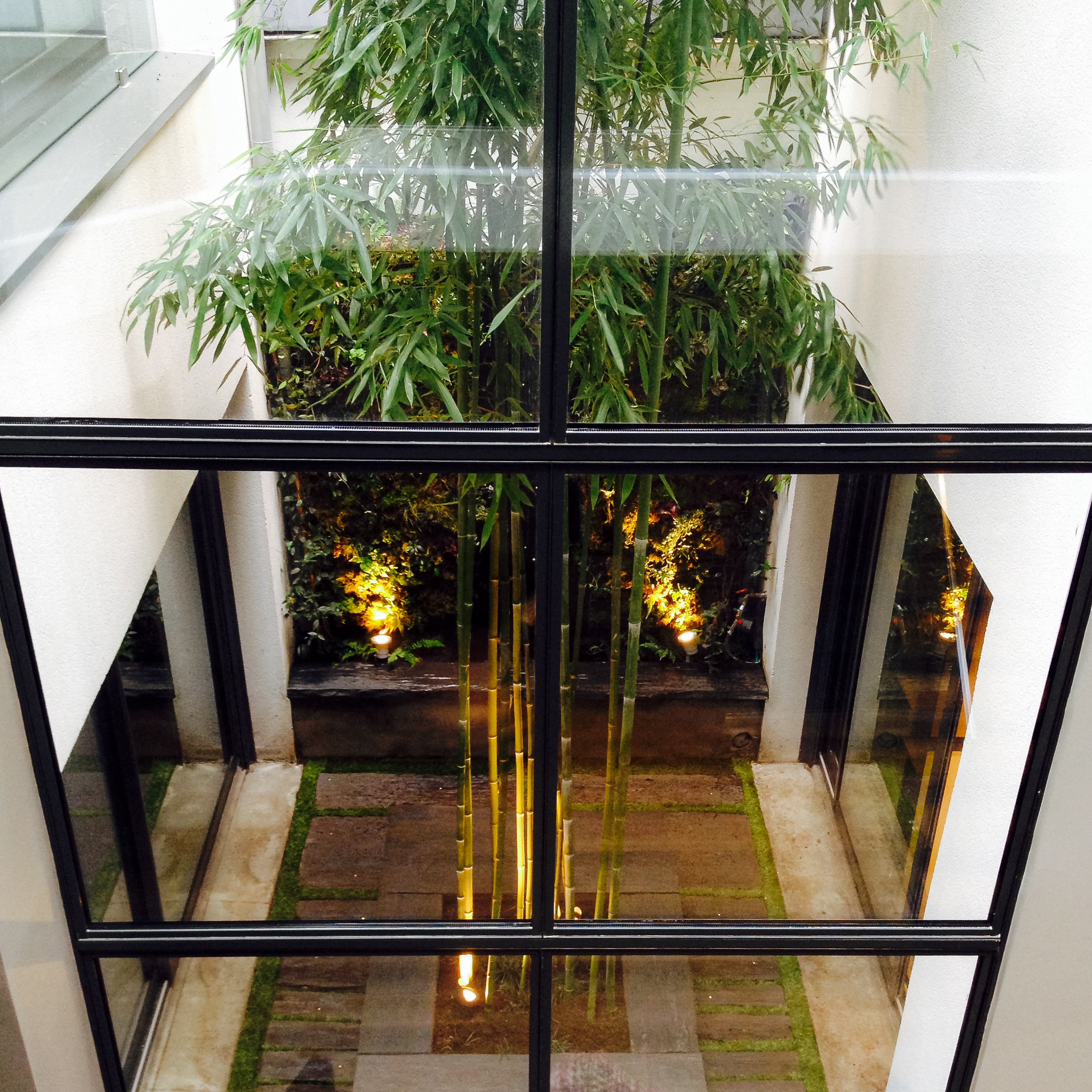 Maison de Ville Le projet : Aménager ce mini patio, en végétalisant et en gardant le passage de la lumière . Cet espace autour duquel toute la maison s’articule sur ses deux niveaux . La fontaine en pierre avec des mini leds intégré, apporte un petit bruit de fraicheur lorsque les fenêtres sont ouvertes. Paris 15ème 75 Conception Fabio Pane Chantier LADPJ